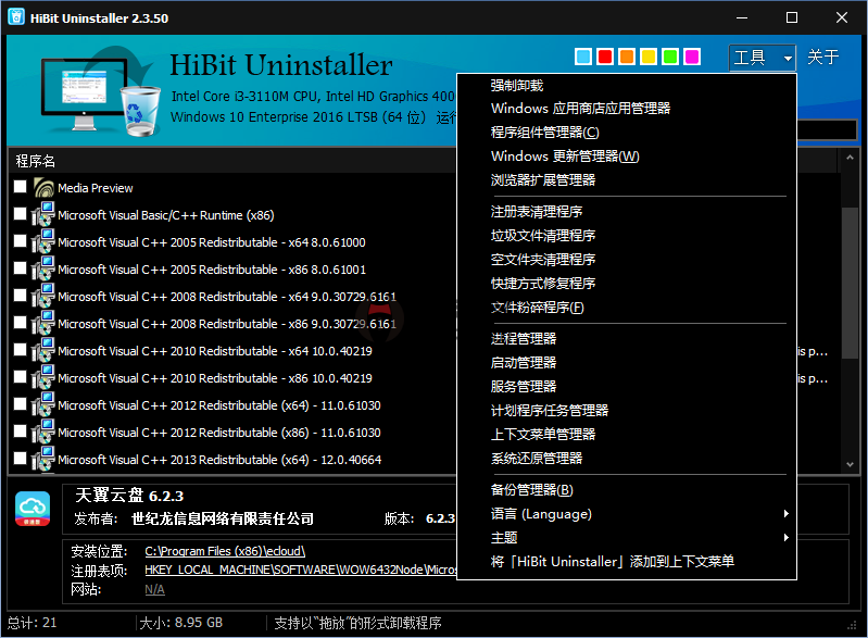 HiBit Uninstaller除了卸载功能还内置很多辅助卸载系统优化的小工具,比如:Windows应用商店应用管理器,程序组件管理器,浏览器扩展管理器,注册表清理程序,垃圾文件清理程序,空文件夹清理程序,快捷方式修复程序,文件粉碎程序(F,进程管理器,启动管理器,服务管理器,计划程序任务管理器,上下文菜单管理器,系统还原管理器。