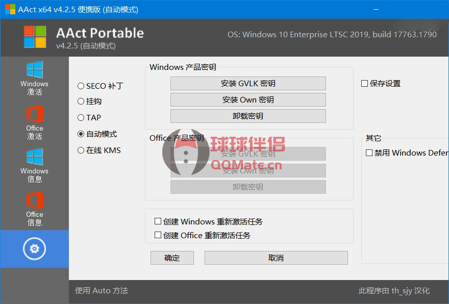 KMS激活工具AAct支持Windows、Office 消费者版和商业版,无需.NET Framework 框架依赖,可以激活Windows XP,Windows 7,Windows 8.1,Windows 10, 11,Windows Server 2008, 2008 R2, 2012, 2012 R2, 2016, 2019, 2022 所有版本以及Office 2010, 2013, 2016, 2019, 2021 零售版及批量许可版。