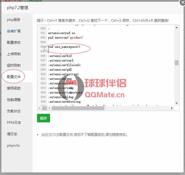 在软件管理中找到对应的PHP版本,设置>配置文件,添加yaf.use_namespace=1 ,参考下图: