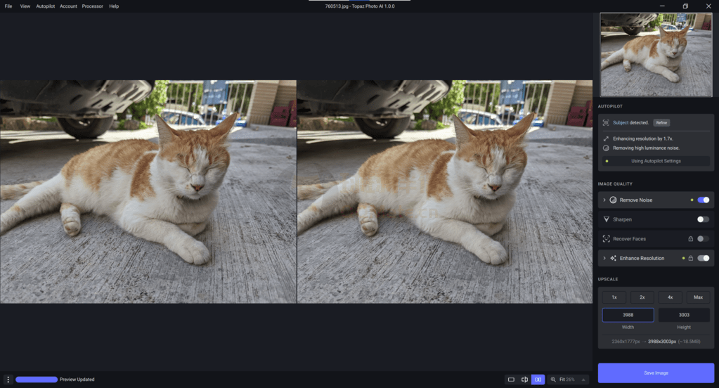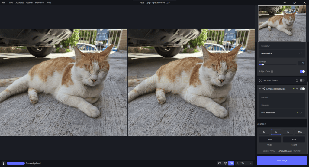 Topaz Photo Al是浓缩集结了这三套优化软体的特色,包含降噪+锐化+提高清晰度的功能,并且是以智能的方式来进行优化,软件会自动判断照片是不是需要降噪、锐化等处理,也有让你提高照片清晰度的选项,不需要分别使用三套软件汇入照片进行处理,直接一套Topaz Photo AI就全部搞定,所以对于想要简单轻松优化照片的人来说会更加容易上手,很适合想要快速优化照片的人使用。