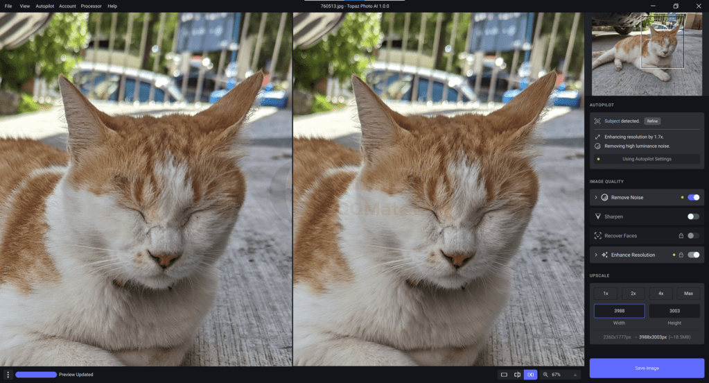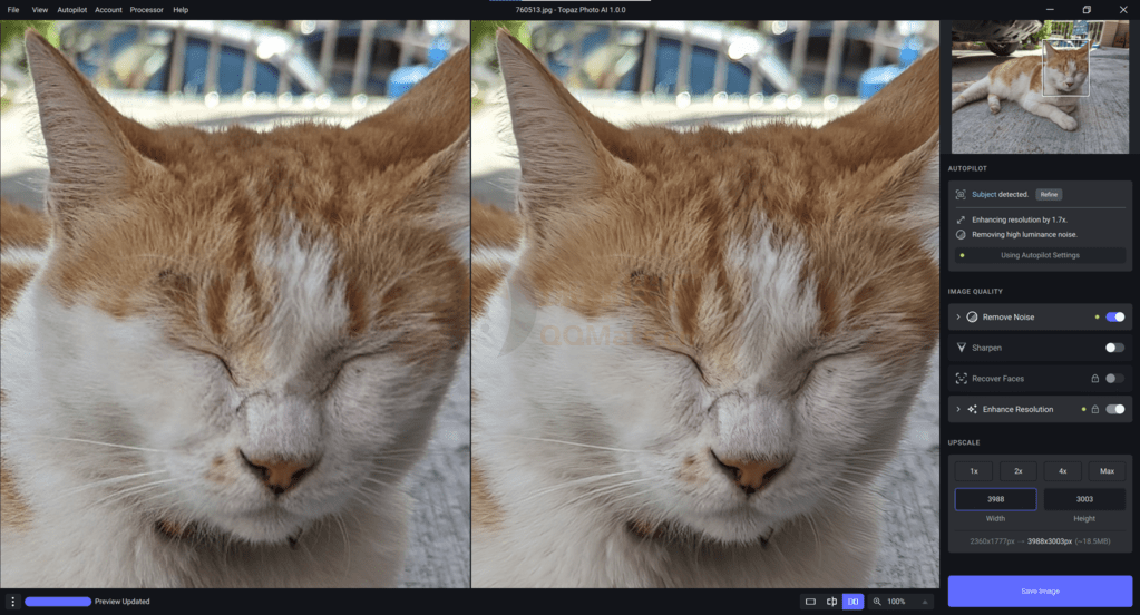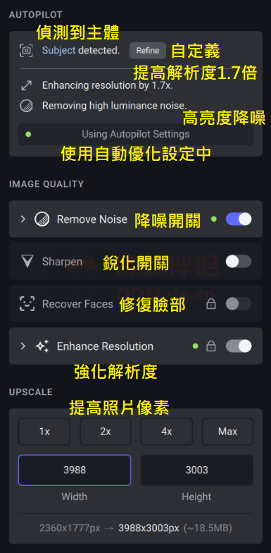 软件侦测到猫咪是这张照片的主体(Subject detected),而Al自动优化的部分包括Enhancing resolutionby 1.7x,也就是说原本的照片尺寸太小,有稍微提升至1.7倍大,让细节看起来更明显;另外还有Removing high luminance noise,也就是去除高亮度的噪点,果然跟我刚刚看到的预测结果一样,有把噪点的颗粒感优化了。