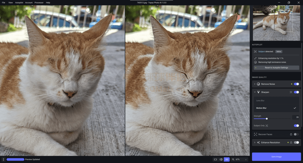 所以我把【Sharpen】锐化功能给打开,软体自动锐化的预设值是35,很明显预览猫咪的毛细节都出来了!