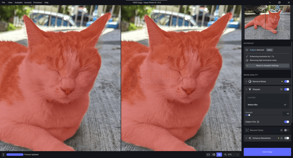 sharpen锐化的部分可以将Subject Only打勾,也就是Al会自动侦测到照片的主体是猫咪,只想锐化猫咪的部分就好,不要整张照片连同背景都锐化了,红色的部分就是猫咪主体。