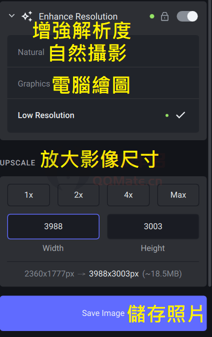 增强解析度的部分可以依照图片的类型,分别有Natural自然摄影、Graphics电脑绘图和LowResolution低解析度图片来勾选; upscale则是照片尺寸如果太小,可以依倍率来放大尺寸。
