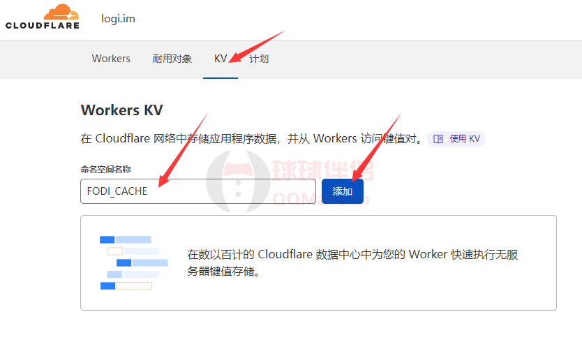 保存好代码后,切换到顶部菜单栏的 KV 标签。在 命名空间名称 下方的输入框中输入 FODI_CACHE,随后点击右边蓝色的 添加 按钮。