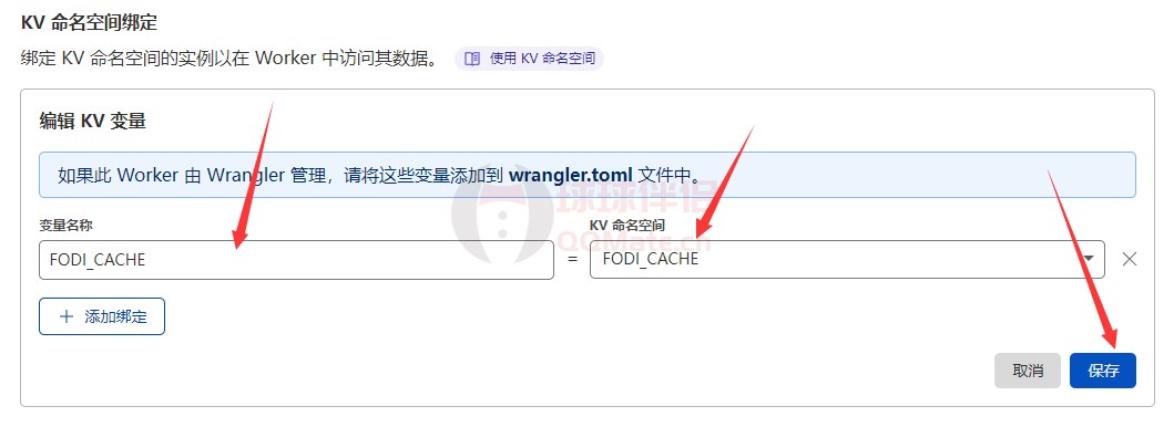 在 变量名称 下方的输入框键入 FODI_CACHE,KV 命名空间 下拉框也选择 FODI_CACHE,最后点击 保存。