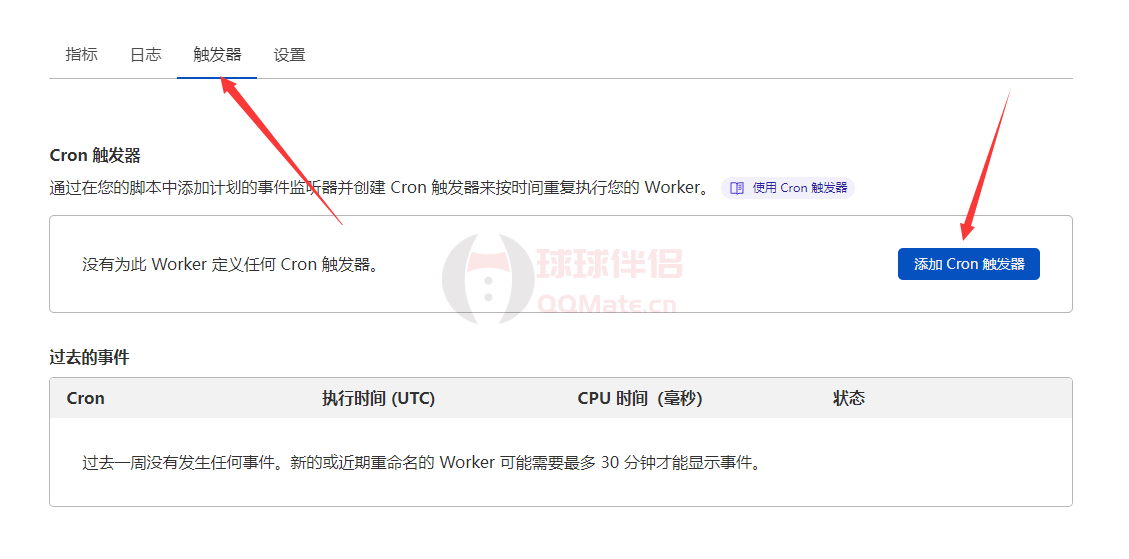 转到设置左边的 触发器 面板,点击页面右边蓝色的 添加 Cron 触发器 按钮。
