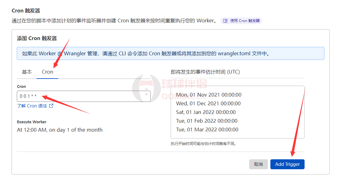 切换到 添加 Cron 触发器 项目的 Cron 标签,在 Cron 下方输入框键入 0 0 1 * *,最后点击右下方蓝色的 Add Trigger 按钮。