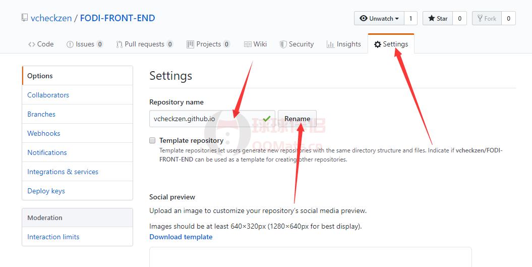 点击靠近页面右上角的 Settings,将 Repository name 改成 你的 Github 用户名.github.io,随后点击 Rename。