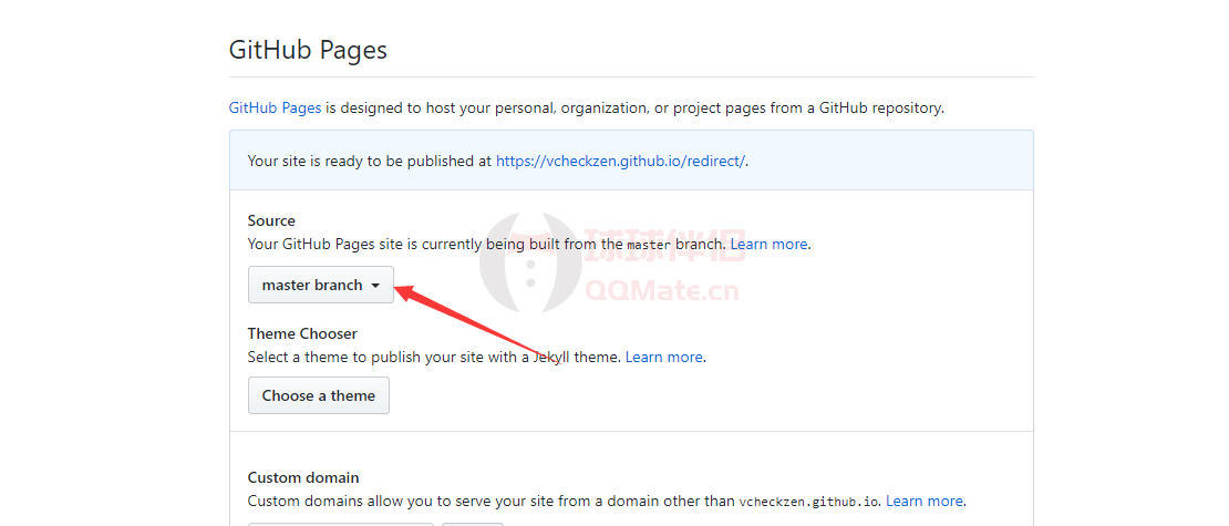 下拉该页面,找到 Github Pages,将 Source 下拉框的值改成 master branch,如果没有则无需修改。