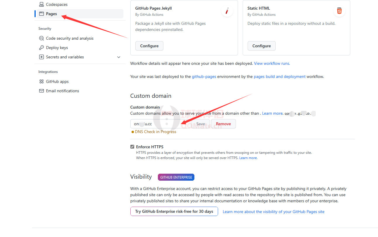 由于github赠送的域名也是时不时就挂,这里同样可以绑定自己的域名进行提速。