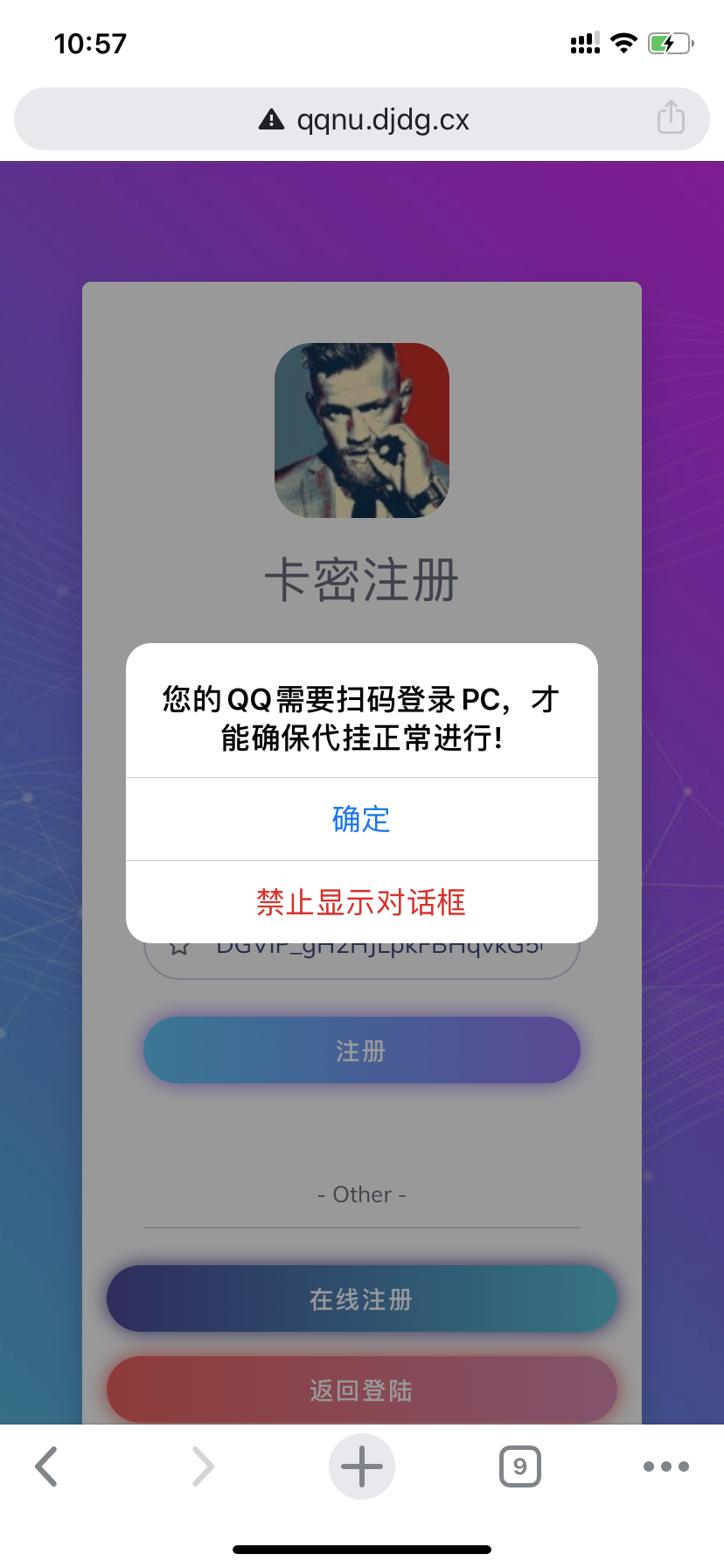 1.注册时若出现提示:【你的QQ已存在,必须删除后才能添加】需要按照提示扫码删除之前的代挂记录,才能使用爱准挂服务,不会可以联系客服。 如过跳不出删除QQ的界面 可以打开 http://qqnudg.52dg.cn/adg.php?qq=你的QQ 把后面换成你的QQ号码即可