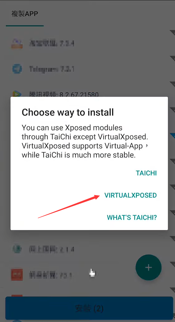 选择弹出的提示框第二个 “VIRTUALXPOSED”,系统会开始安装两个APP,提示安装完成后点“完成”