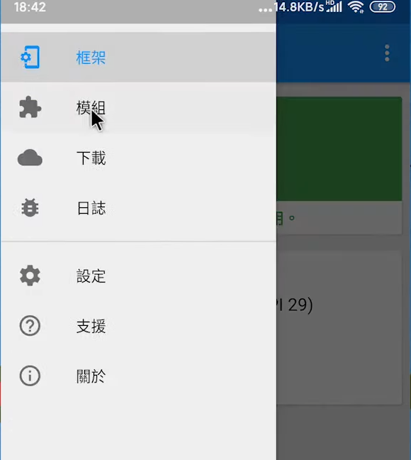 打开VirtualXposed APP 上滑,点击Xposed Installer,点击左上角的三个横线,选择模组