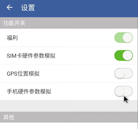 点击右上角设置,关闭GPS位置模拟开关和手机硬件参数模拟开关,其他的都是默认不用操作。