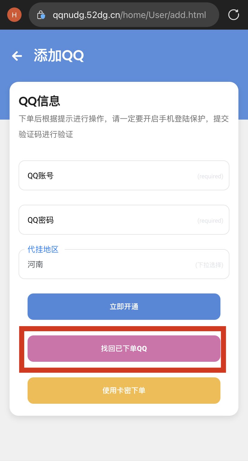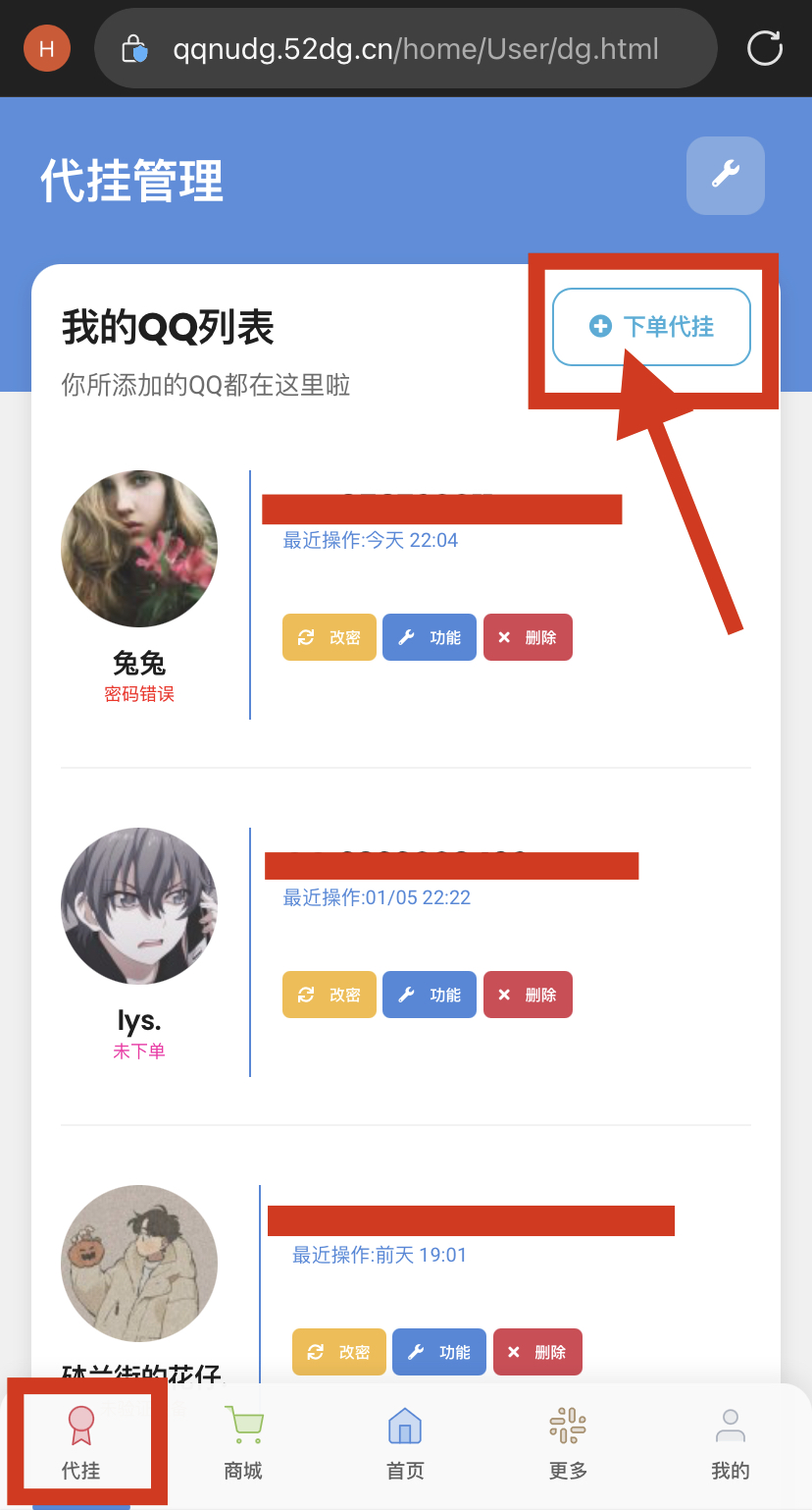 2、登陆账号,手机用户点左下角【代挂】,电脑用户点最上方的【代挂管理】,然后点击【下单代挂】,点击【找回已下单QQ】,选择【验证密码找回2】,输入正确的QQ密码进行找回。注意:该操作不可逆