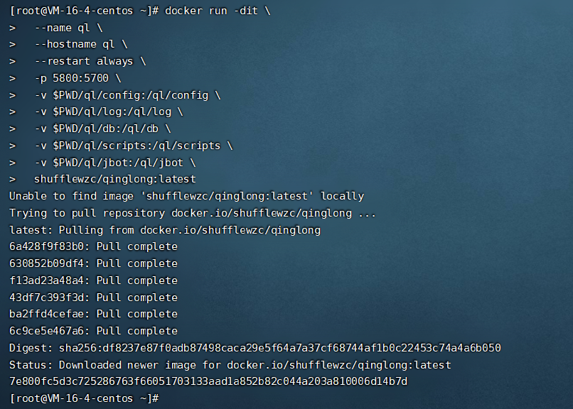 #目前最新版的青龙跟傻妞机器人的某些命令不兼容,建议使用青龙2.12.2 #将下方的qingling:latest 改成qinglong:2.12.2 #最新版青龙 #拉取镜像 docker pull whyour/qinglong:latest #下方的命令全部复制粘贴不是一次一行 docker run -dit \ -v $PWD/ql:/ql/data \ -p 5700:5700 \ --name qinglong_1 \ --hostname qinglong_1 \ --restart always \ whyour/qinglong:latest