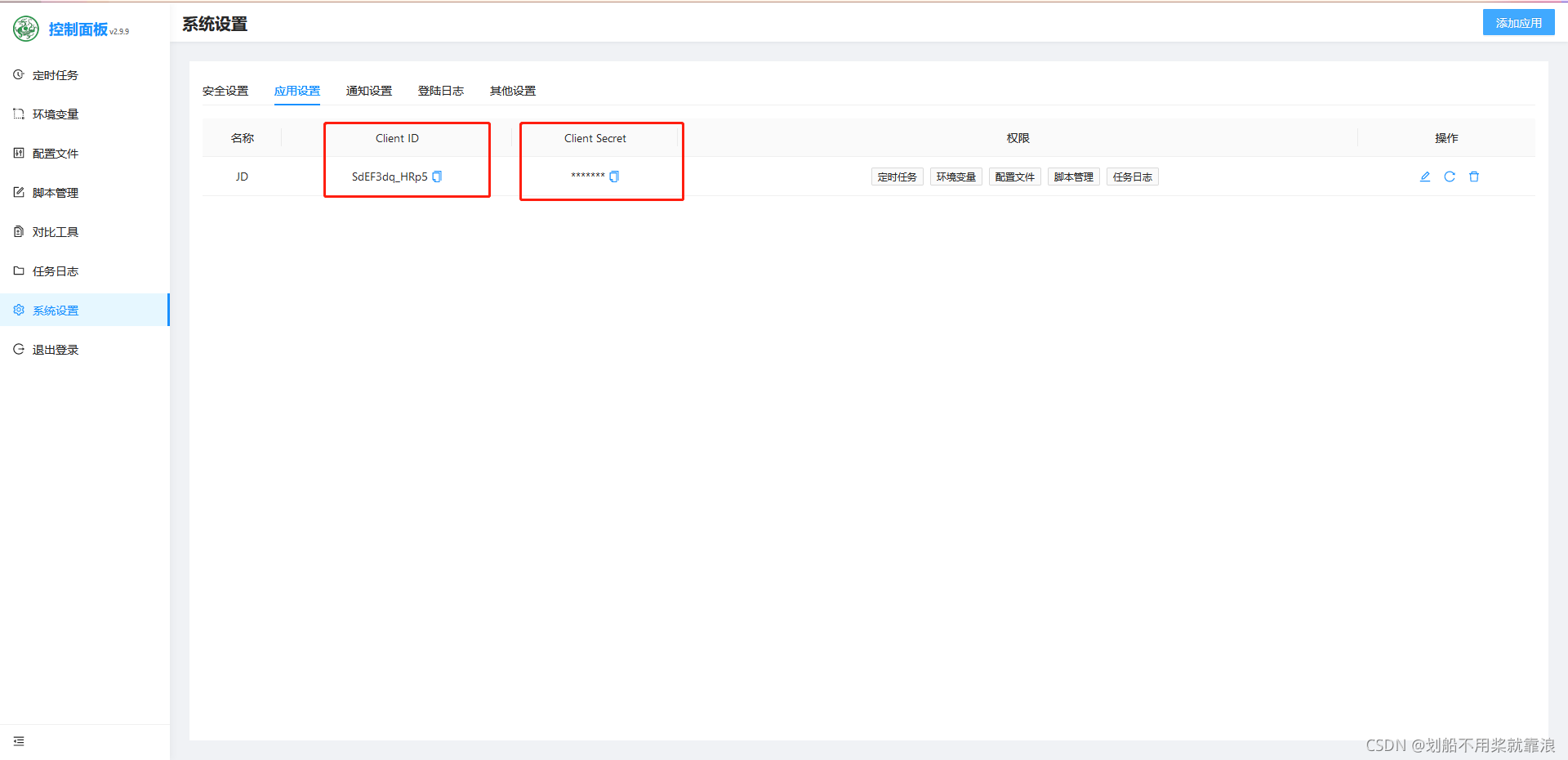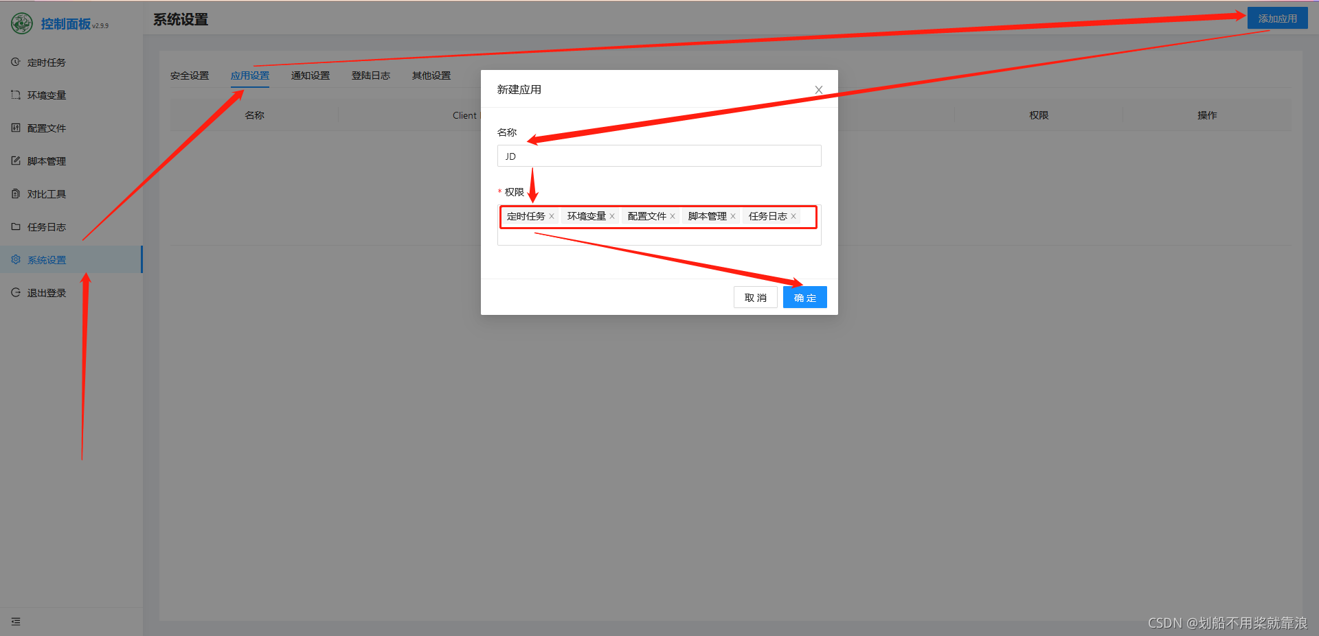 青龙面板==》系统设置==》应用设置==》添加应用==》名称随意==》权限全选