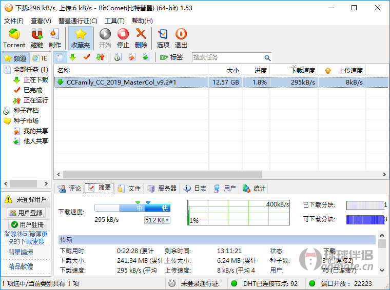 比特彗星(BitComet)是一款专业的老牌国产BT下载软件,免费BT资源下载利器!BitComet独有长效种子功能,大幅度增加下载速度,增加种子存活率。这款BT下载客户端支持BT/HTTP/FTP,支持BitTorrent(BT协议)、Magnet(磁力链接)、eD2k(电驴下载加速),支持制作BT种子文件发布,自动订阅挂机做种,支持网页远控,支持DHT网络及UPnP映射,支持32M区块分区,具有磁盘缓存提速服务,支持视频边下边看。