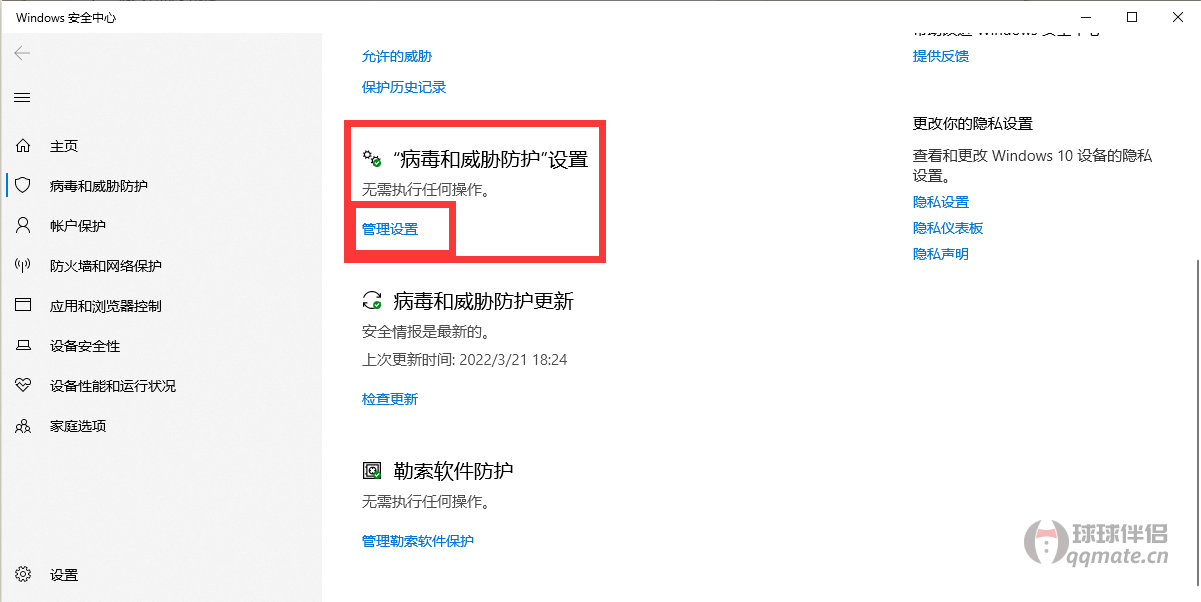 依次点击 更新和安全 》 Windows安全中心 》 病毒和威胁防护 》 病毒和威胁防护 》病毒和威胁防护设置 》管理设置 将 实时保护、云提供保护、自动提交样本、篡改防护 全部关闭