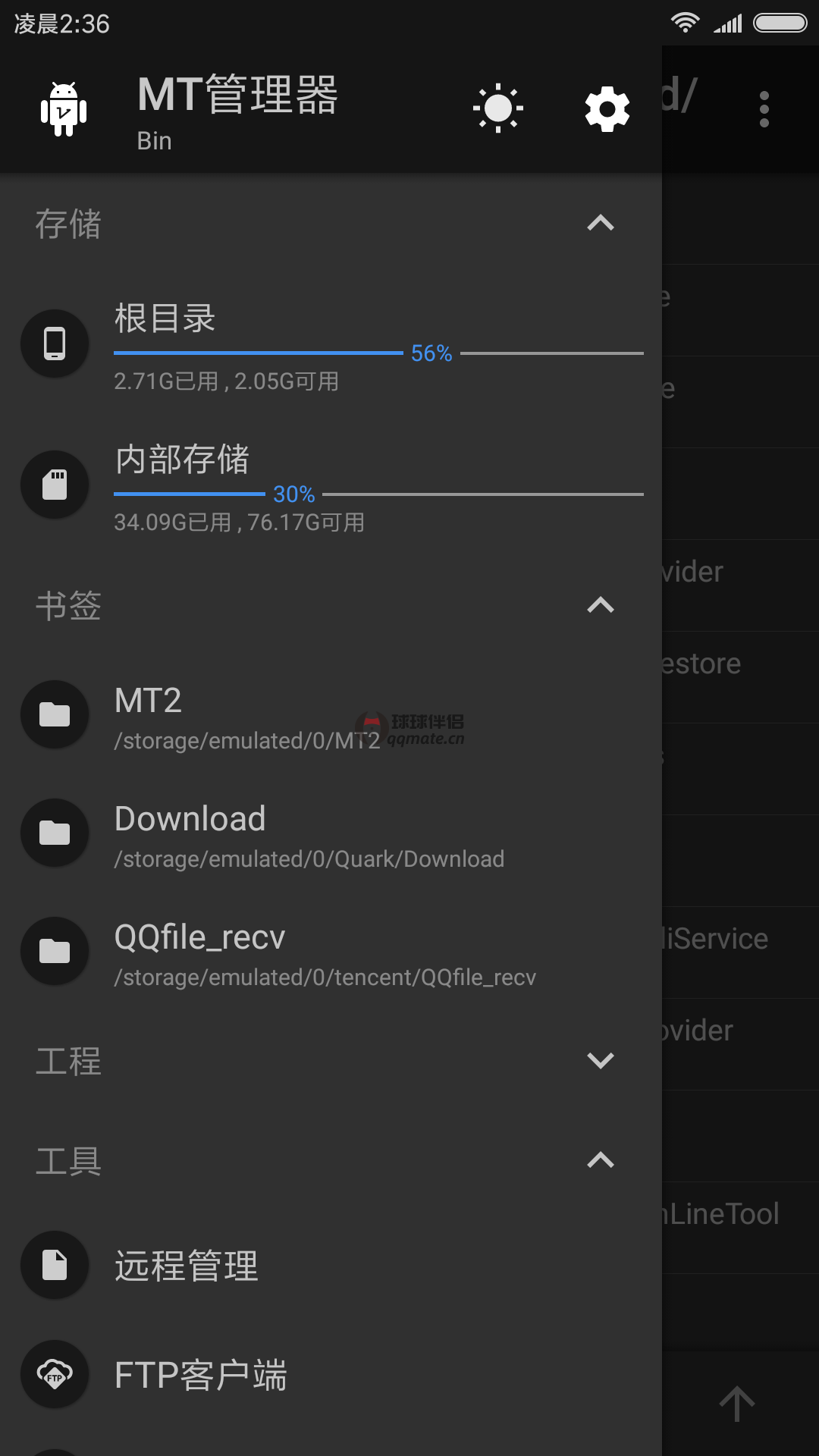 - 拥有图片查看、音乐播放、字体预览、执行脚本、文本对比等功能,在侧拉栏中可方便地查看存储设备、FTP连接、书签、后台、工具等。