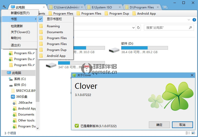 Clover,给资源管理器加上类似Chrome的标签,为您的 Windows Explorer 插上翅膀!Clover 是 Windows Explorer 资源管理器的一个扩展软件,为资源管理器增加类似谷歌 Chrome 浏览器一样的多标签页功能。Clover 把 Chrome 标签页有的样式、功能、右键菜单、快捷键全部移植,Chrome 控瞬间上手。